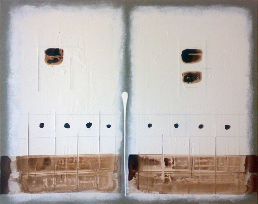 Vier streepjes naast elkaar, gekrast, geschilderd of getekend. Vier vlakjes, vier punten, vier vlekken. Het is een motief dat constant opduikt in de schilderijen van Casters. Vier lijntjes, soms ook twee lijntjes in kruisvorm. Twee lijnen die elkaar in twee gelijke delen verdelen. Een kruis of een X. Opnieuw vier.
